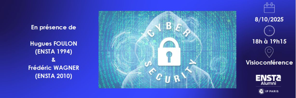 ENSTA Alumni organise, le mercredi 8 octobre à 18h, une visioconférence "Cybersécurité : regards croisés entre entreprise & administration" en présence de Hugues FOULON (ENSTA 1994), CEO Orange Cyberdéfense et directeur exécutif Orange, et Frédéric WAGNER (ENSTA 2010), colonel de gendarmerie, chargé de mission auprès de l’Agence du numérique des forces de sécurité intérieure (ANFSI).