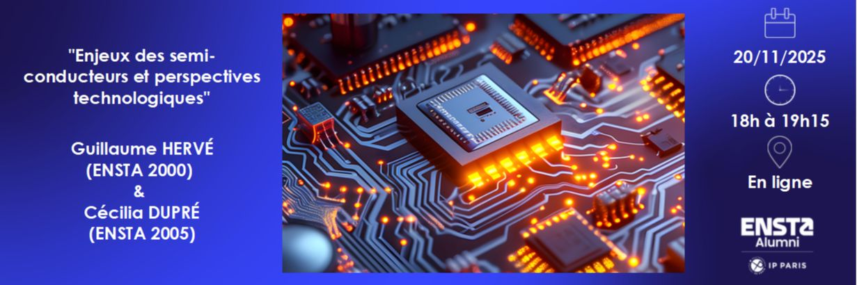 ENSTA Alumni organise, le jeudi 20 novembre à 18h, une visioconférence "enjeux des semi-conducteurs et perspectives technologiques" en présence de Guillaume HERVÉ (ENSTA 2000) et Cecilia DUPRE (ENSTA 2005), respectivement responsable du programme défense et responsable du laboratoire des dispositifs quantiques au CEA-Leti, centre de recherche leader mondial des technologies de miniaturisation novatrices.