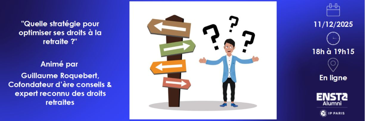 ENSTA Alumni organise une visioconférence "Quelle stratégie pour optimiser ses droits à la retraite ?" le jeudi 11 décembre à partir de 18h, animée par Guillaume Roquebert, cofondateur d’ère conseils et expert reconnu des droits retraites.