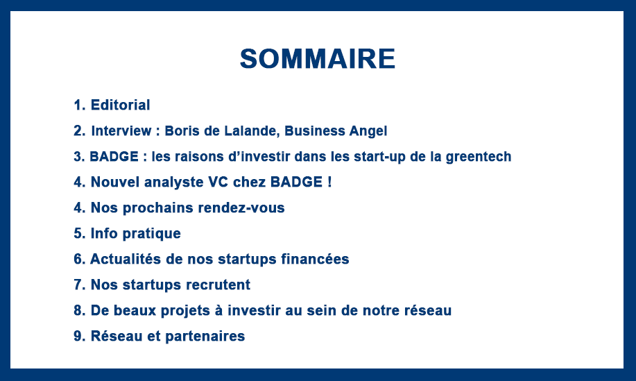 2) Qu'est-ce qui vous a motivé à rejoindre le réseau BADGE en tant que business angel ? Après 5 années d'expatriation, l'obtention de ma résidence principale, et un seul enfant à charge en garde alternée qui plus est, j'avais un peu d’épargne de côté, et je voulais l’utiliser et la placer intelligemment, dans une optique de rendement bien sûr, sans besoins à court terme, mais aussi dans une logique de financements de projets à impact, ou que j'avais envie de suivre et d'aider.