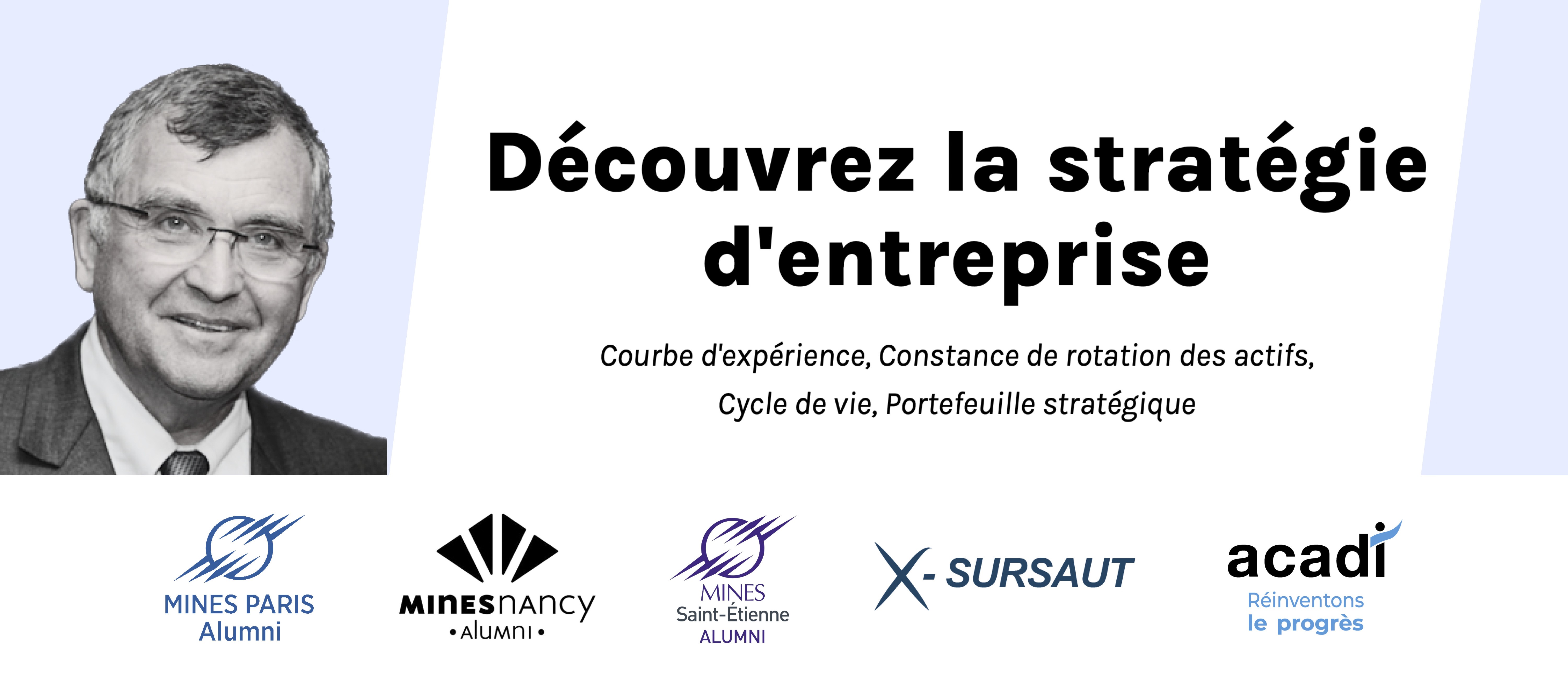 |  | Formation en ligne à la stratégie d'entreprise Les associations d’alumni de Mines Paris, Mines Nancy, Mines Saint-Étienne, X-Sursaut (club de l’AX), Xavier Fontanet (ancien PDG d’Essilor) et l’ACADI (Association des CAdres et DIrigeants pour le progrès social et économique – éditeur de la formation) vous proposent une immersion vivante et accessible dans les fondamentaux de la stratégie d’entreprise. En savoir plus. |