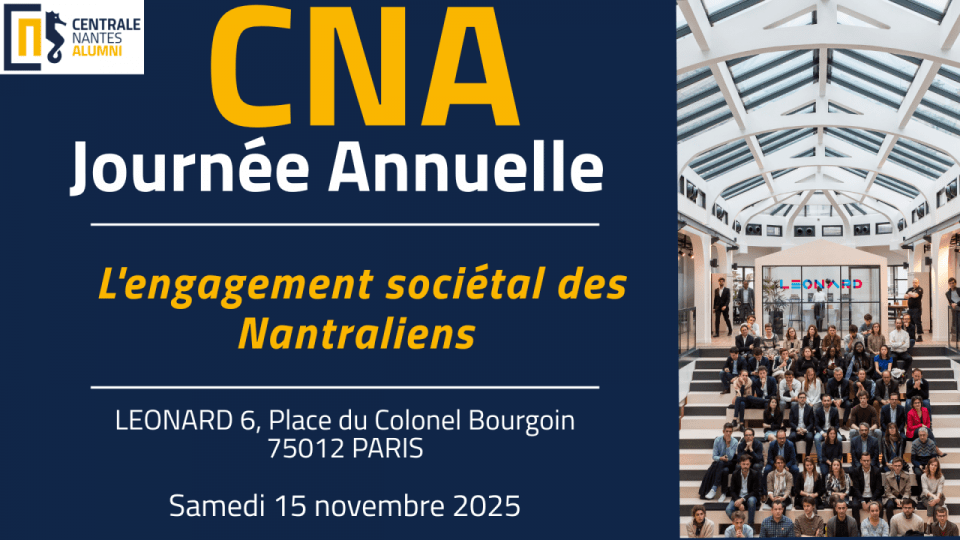 | Journée Annuelle des Nantraliens La Journée Annuelle de Centrale Nantes Alumni se déroulera le 15 novembre, sur le thème de l'engagement sociétal des Nantraliens. L'évènement commencera par l'Assemblée Générale de l'association, puis des diplômés de Centrale Nantes prendront la parole pour partager leurs expériences et leurs engagements associatifs, culturels et professionnels. En savoir plus et s'inscrire. |