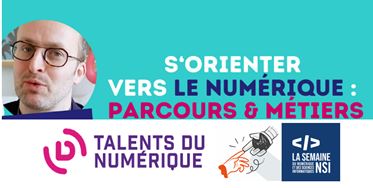 |  | S’orienter vers le numérique Les 10 et 11 décembre, dans le cadre de la Semaine du numérique, l’association Talents du numérique est ravie de vous proposer un webinaire intitulé "S’orienter vers le numérique: parcours et métiers ! " Elle a pour mission de développer l’attractivité des métiers et des formations du numérique auprès des jeunes générations, garçons et filles. Le webinaire décryptera l’ensemble des parcours au lycée et dans l’enseignement supérieur permettant de rejoindre ce secteur dynamique et innovant. S'inscrire. | | |