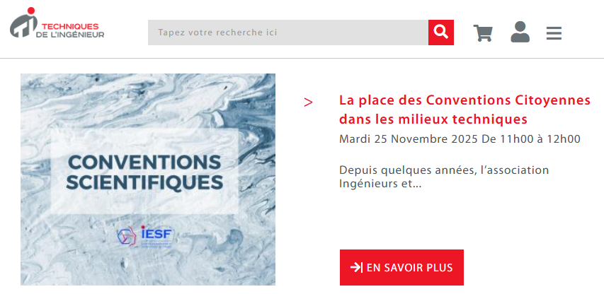 | | Webinaire Techniques de l'Ingénieur sur les Conventions Scientifiques d'IESF Le 25 novembre, Techniques de l'Ingénieur organise un webinaire sur la place des Conventions Citoyennes dans les milieux techniques. Nicolas Burger et Lou Grimal du Comité Docteur d'IESF feront le point sur l'importance des conventions scientifiques pour façonner le monde d'aujourd'hui et de demain. En savoir plus et s'inscrire. |